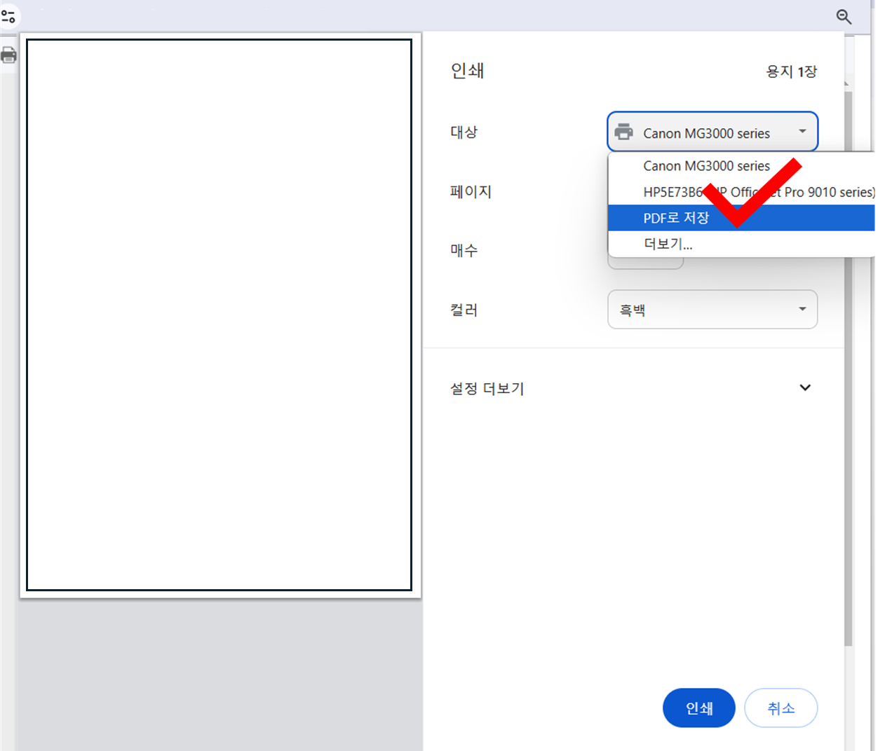 인쇄 화면으로 넘어가면 출력 옵션에서 기본 프린터 설정을 PDF로 저장으로 변경합니다.