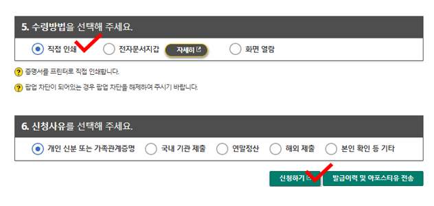 수령방법에서 '직접 인쇄'를 선택하고 가장 하단에 있는 '신청하기' 버튼을 클릭합니다.